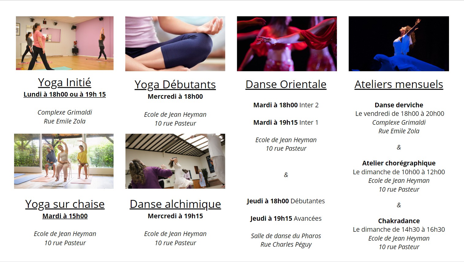 Nous proposons un enseignement des danses orientales, Yoga, énergie du corps, danse sacrée, au travers de stages, de cours collectifs ou individuels, sur Arras et toute la région Hauts-de-France.
