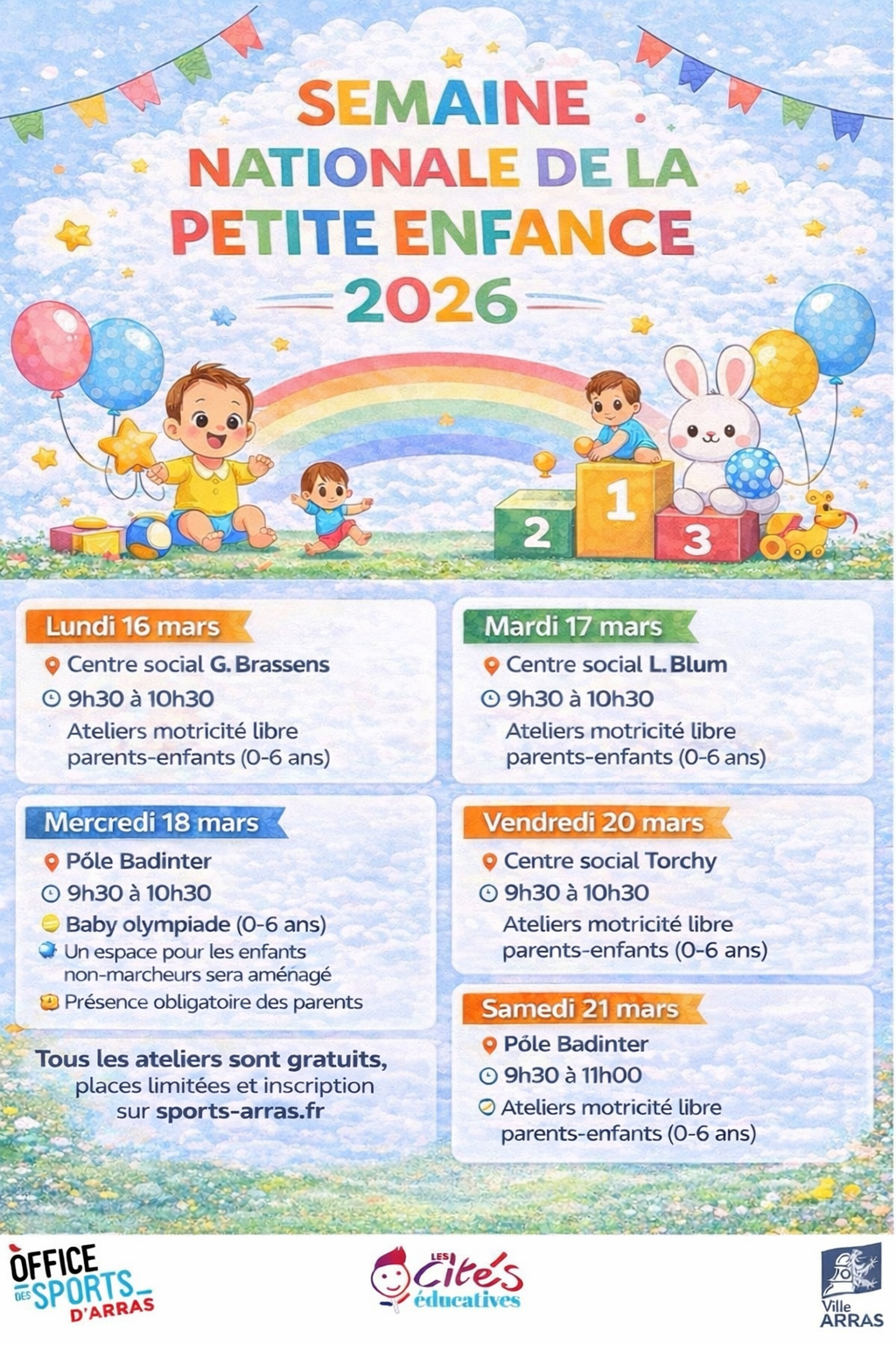 A l’occasion de la Semaine Nationale de la Petite Enfance 2026 et en partenariat avec la Ville d’Arras, l’Office des Sports d’Arras vous propose des ateliers de motricité libre parents-enfants pour les 0-6 ans.