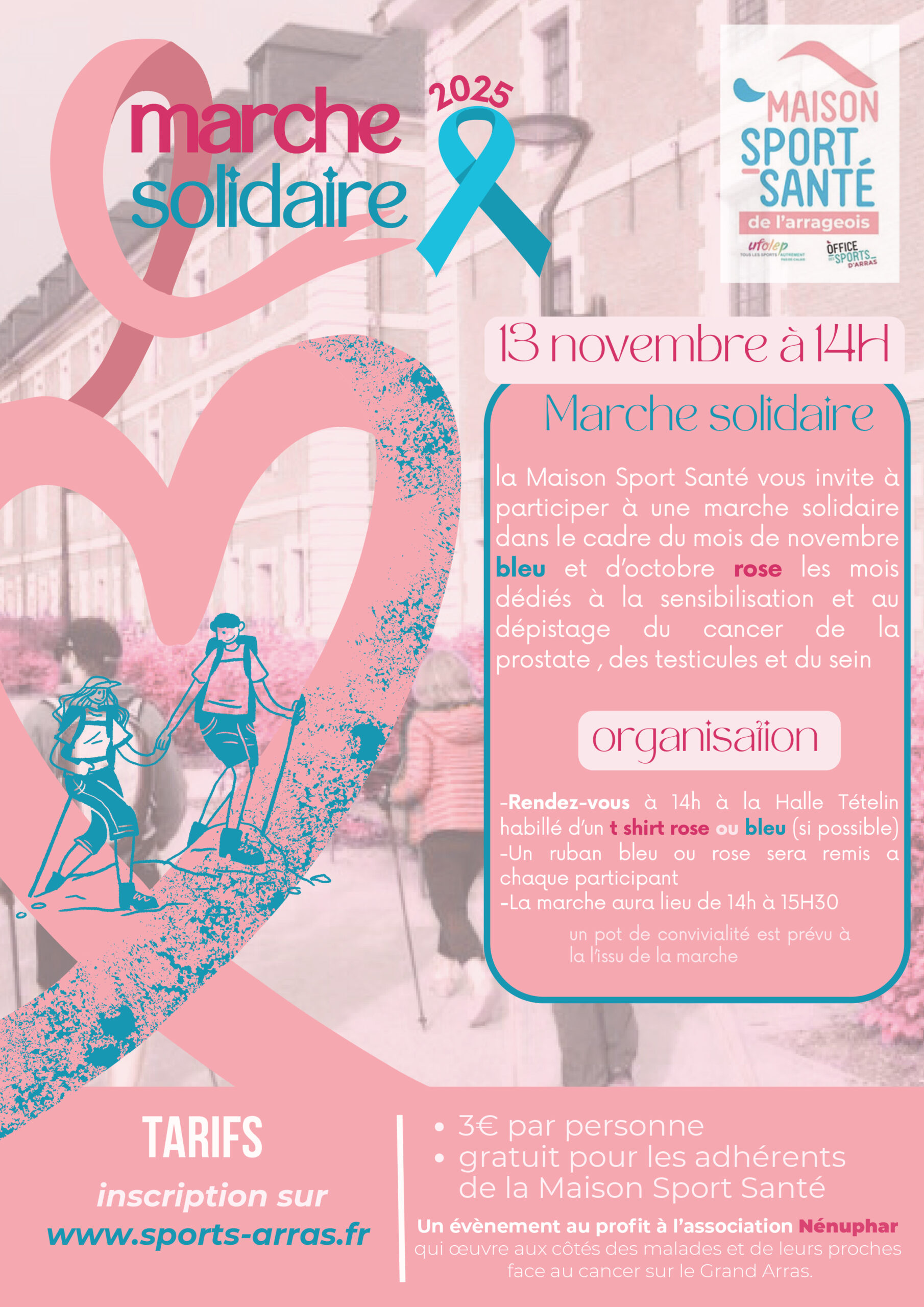 La Maison Sport Santé de l’Arrageois vous invite à participer à une marche solidaire au cœur de la ville d’Arras, à l’occasion d’Octobre Rose et de Movember, mois consacrés à la sensibilisation aux cancers du sein, de la prostate et des testicules.